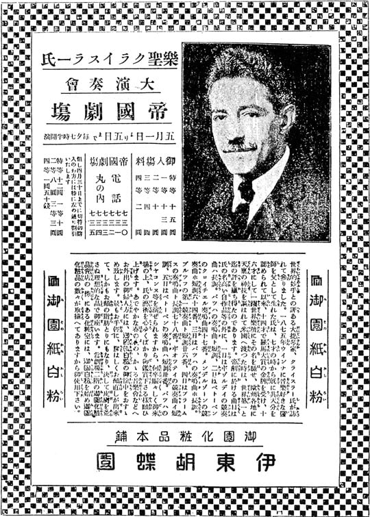 当時の新聞広告が残っており、帝国劇場のプログラムは、〈ヴィヴァルディ 協奏曲〉、〈バッハ ソナタ ト短調〉、〈ベートーヴェン クロイツェルソナタ〉、〈ブラームス ソナタ 第1番「雨の歌」〉、〈バッハ シャコンヌ〉等、名曲尽くしだったようです✨